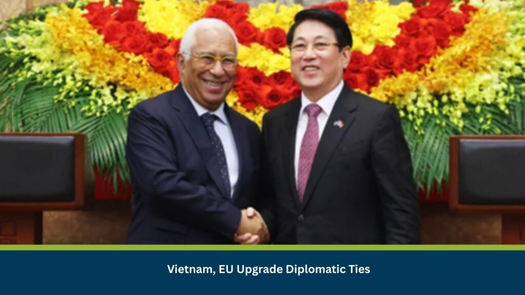 Vietnam has upgraded its ties with the European Union to a comprehensive strategic partnership, the country’s highest diplomatic level, after a visit by European Council President António Costa to Hanoi. The increasing diplomatic ties between Vietnam and the EU are aimed at expanding global partnership amid global disruptions and US tariff pressure. The decision places the EU on the same diplomatic footing as the United States, China, and Russia. The upgraded ties would mean more frequent high-level meetings, a stronger partnership, and increased cooperation in various sectors, including defence and semiconductors.